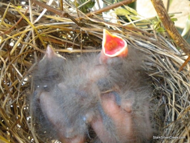 Just as suddenly as the nest and four eggs were discovered, the mother bird, along with the baby birds are gone. As much as I’d like to believe the baby birds learned how to fly and flew away, it seems very unlikely as they were only hatched about five days ago.