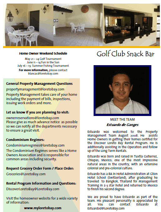 - Employee profile of the month: Estuardo de Ganges (joined August 2008), assists home owners in getting their homes certified for the Discover Loreto Bay Rental Program.