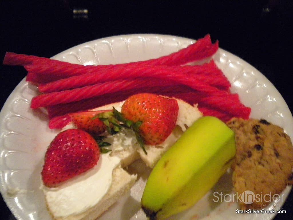 This is Clint’s snack plate, can you tell he likes Twizzlers? Mine had a little bagel, turkey slice and cheddar with a piece of banana and some strawberries.