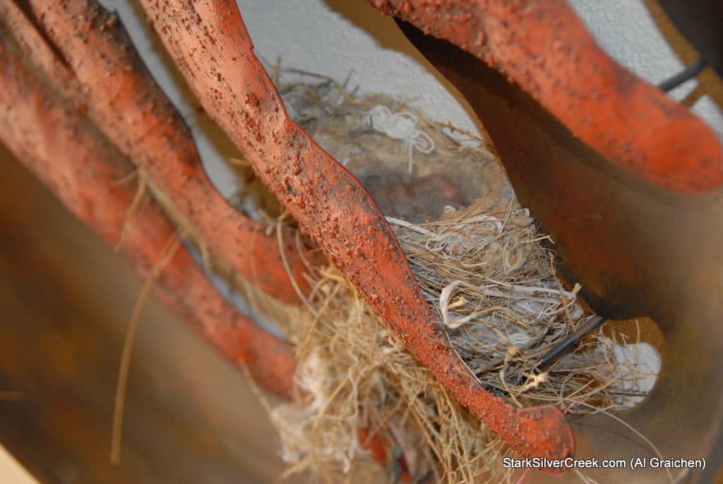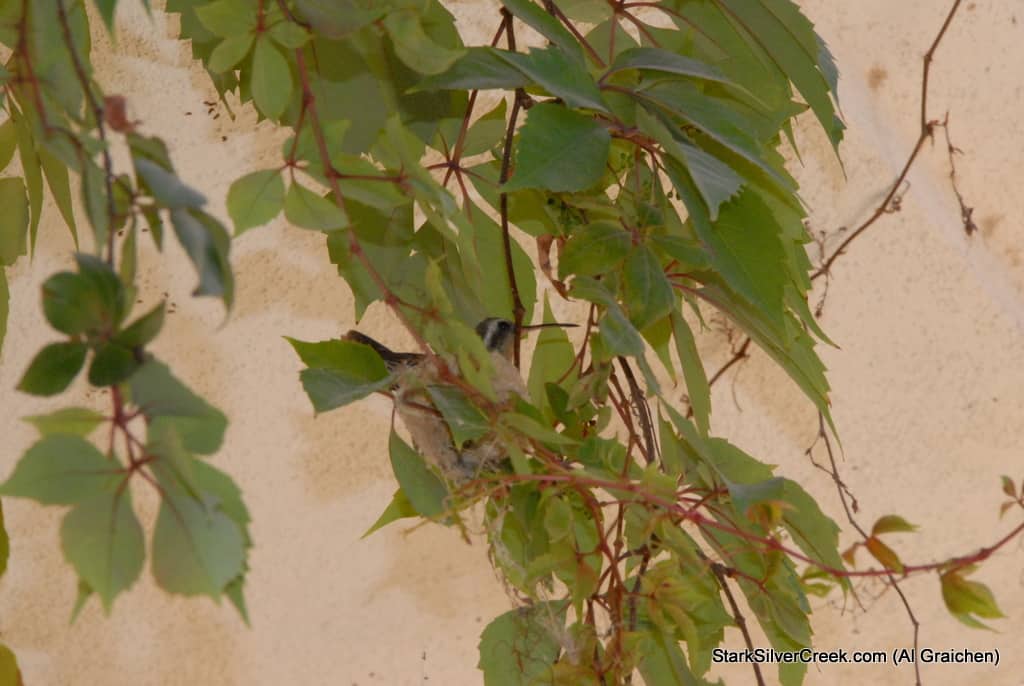 As I was inspecting one of the poorly executed warranty repairs by Ginax on the wall of my Casita, I noted that a hummingbird was hovering about 4 feet from me. I was standing on the second floor Juliet Balcony of our bedroom and just watched the bird move back and forth. Finally figuring I was not going to be any harm s/he darted below me to the garden off the first floor bedroom.