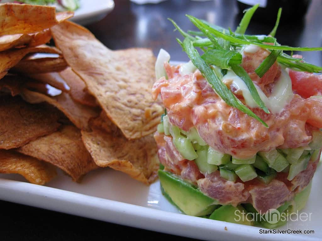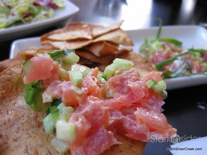 The next course of appetizers consisted a sampling of the Berk’s Big Chopper salad ($8 – tomatoes, white corn, cucumber & croutons, white balsamic vinaigrette) and their Spicy Ahi Tuna Tower ($12 -taro chips, avocado, cucumber & wasabi aioli). The Spicy Ahi Tuna was very fresh and I loved the presentation. Both Clint and I agreed it was not as good as the Blowfish Pyramid of Tartar.