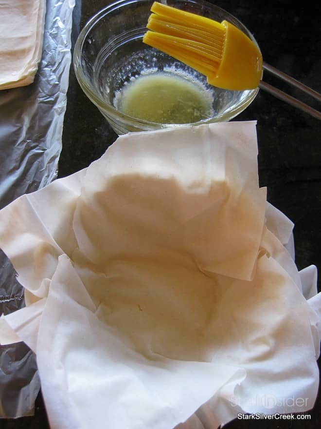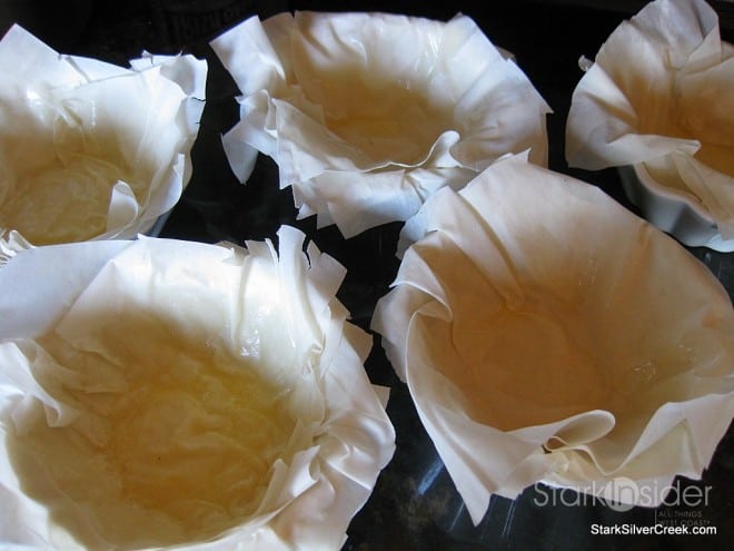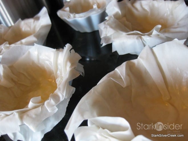 In 6 small ramekin dishes, brush some melted butter. Cut squares of Filo pastry in a size which allows for the pastry to cover the entire inside of the ramekin dishes and have a generous overflow along the edges. Place the first square of Filo in the ramekin dish and then brush the pastry with a thin layer of melted butter. Alternate until you have four pieces of filo pastry in the dish. Repeat for a 6 ramekin dishes. Place in oven and monitor closely. Remove when the edges of the Filo pastry area a nice deep golden brown.