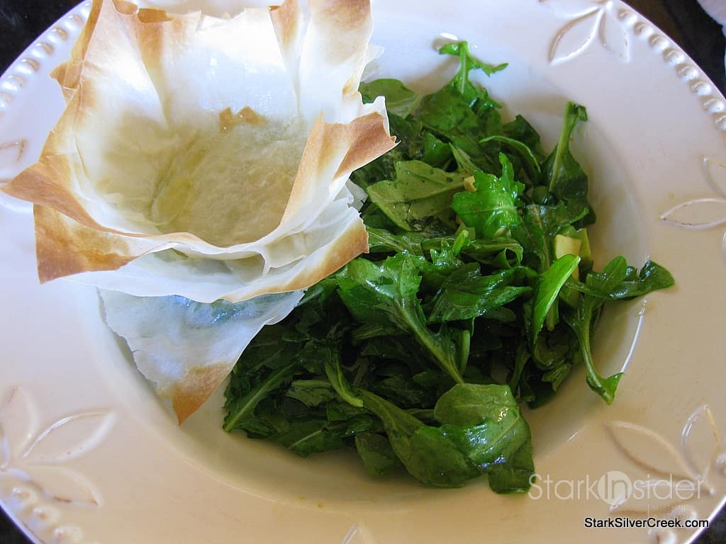 In a large bowl, add 14 ounces of arugula and one chopped avocado. Toss in orange vinaigrette and place on serving plates. Gently remove Filo shells from ramekins and place to one side on the salad. Evenly divide the crab mixture into each Filo shell. Sprinkle with some freshly ground pepper as a finishing touch.
