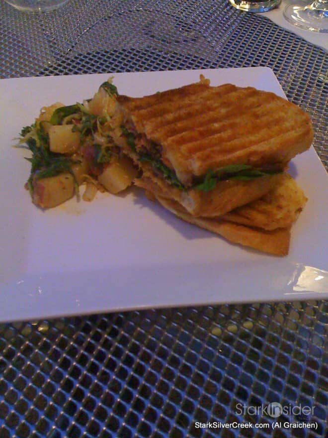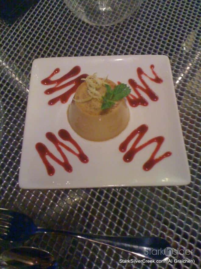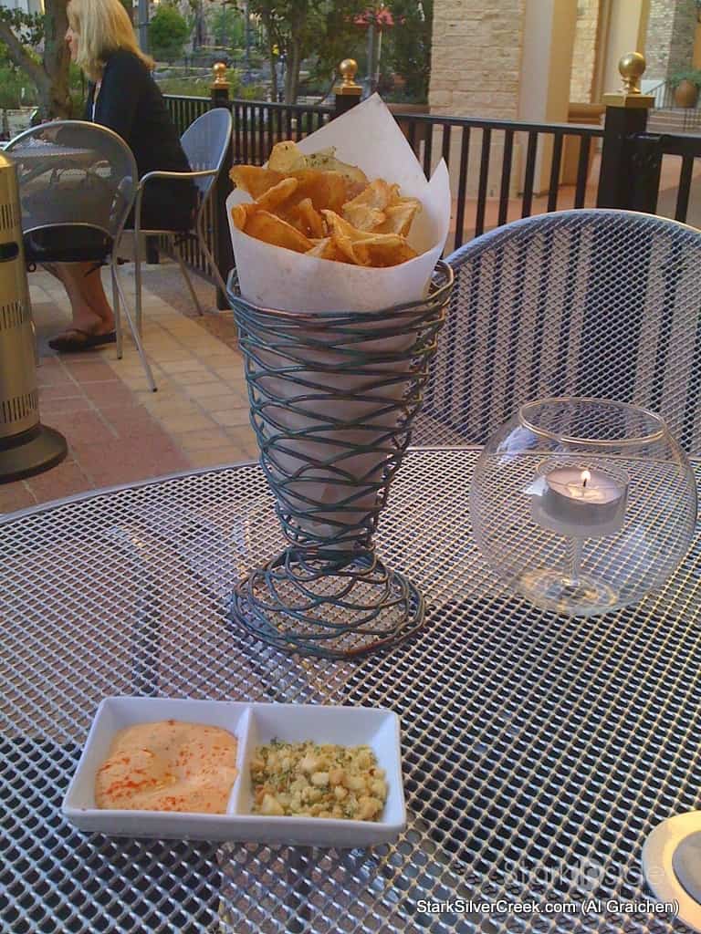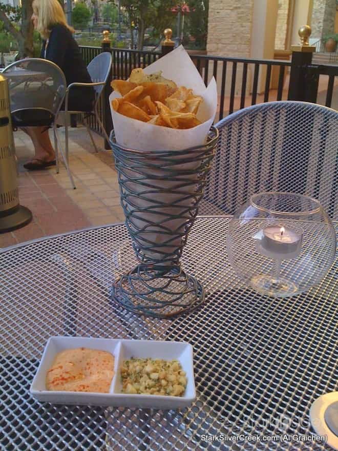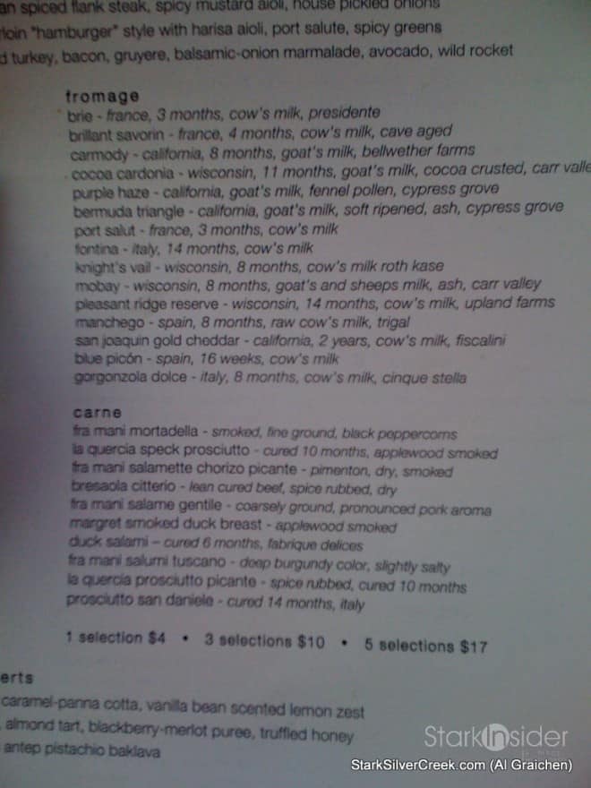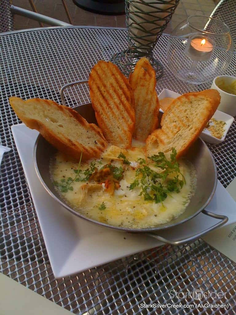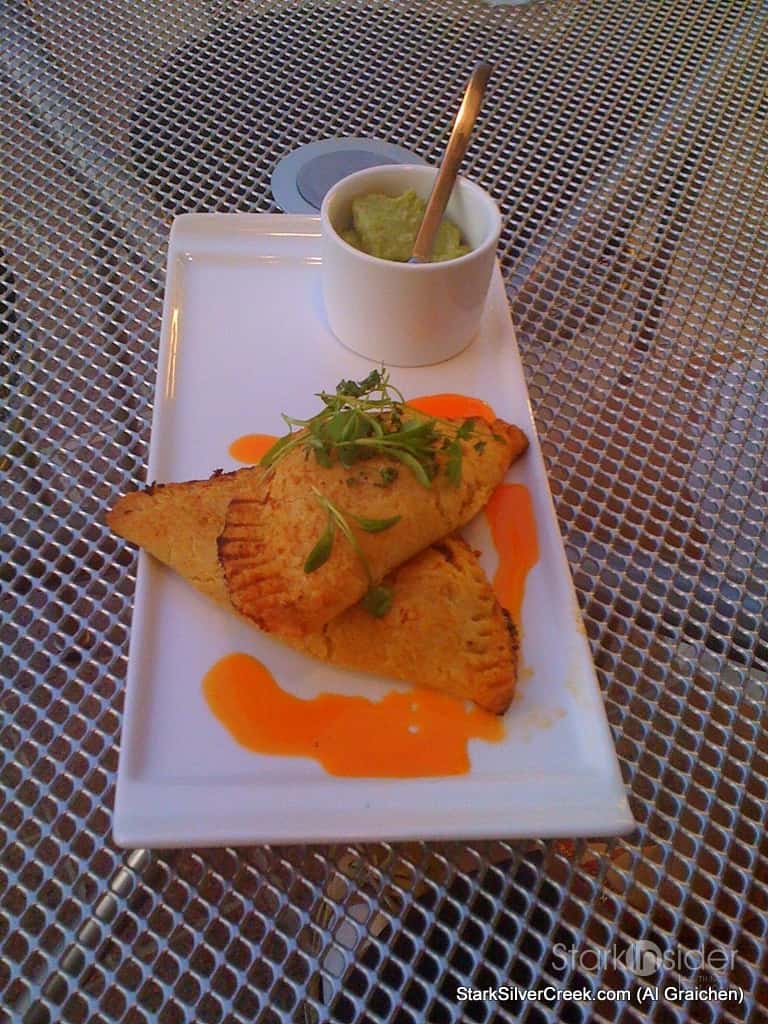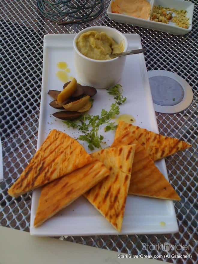 We started with hummus; fresh fava bean, with Moroccan spices and crispy pita bread with cured olives ($7). Next came Cassoulet of baked French cheeses with roasted garlic squash blossoms and chervil on crusty baguette slices ($8). Shrimp empanadas with avocado followed ($9) and we finished with Moroccan spiced flank steak with spicy mustard aioli and house pickled onions ($8). All were excellent.