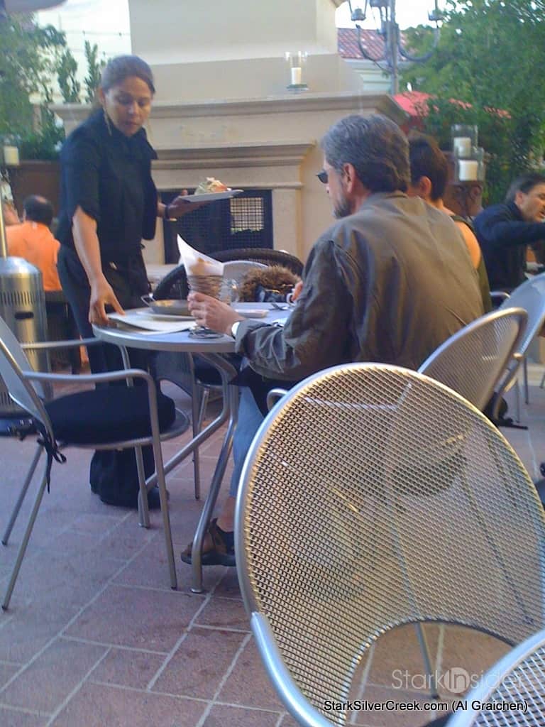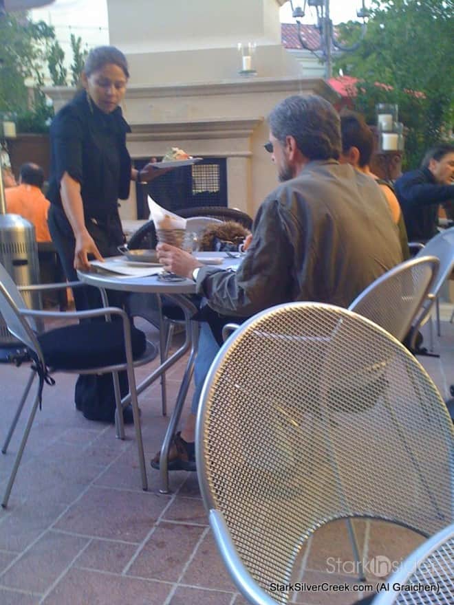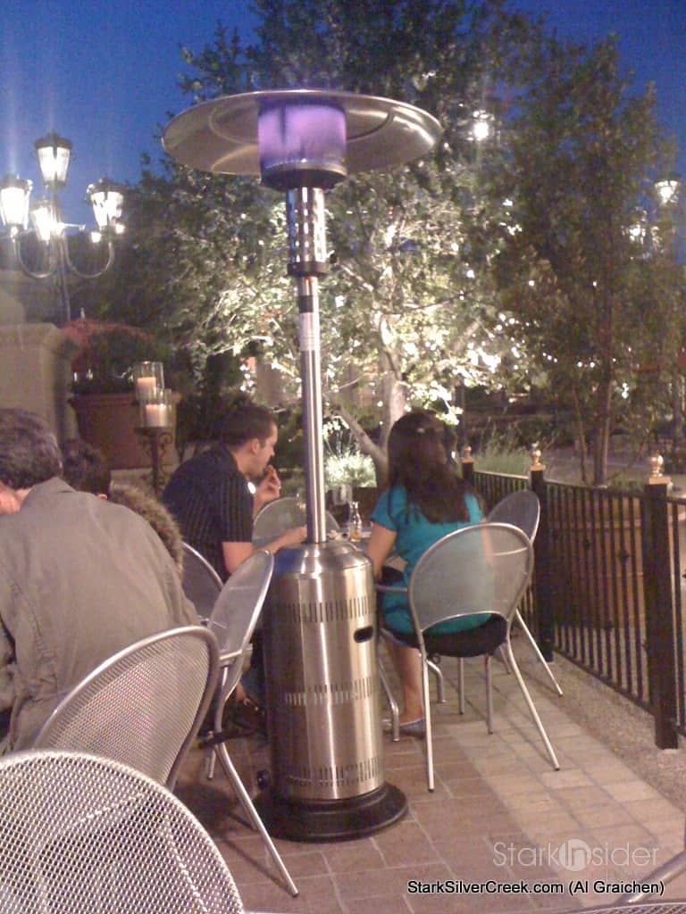 The location is in the middle of the Blackhawk Plaza overlooking the central fountain. The outside dining area has been expanded and includes a large fire place. “Space heaters” are available for cooler evenings.