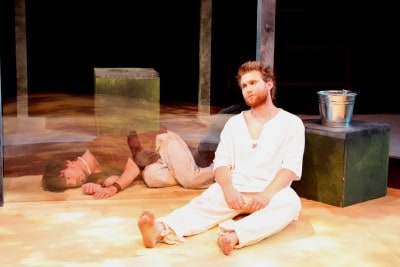 As his fate is debated, Judas (Isaac Benelli) spends the majority of the play in a transfixed, almost Tommy-like catatonic state in a glass chamber. He comes to life in flashbacks with powerful bursts of raw energy and emotion.