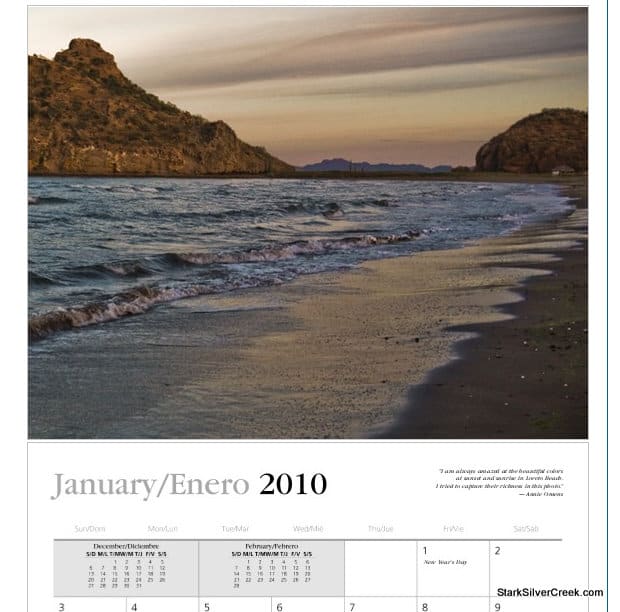 For each month, there is a beautiful photo of Loreto, BCS selected from an incredible number of photos that were submitted to the 2010 Loreto Calendar. Below the photo is a quote by the photographer of the photo. For example, for January, Annie Omens writes: