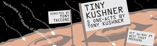 Their next show, Tiny Kushner, is markedly toned down from Idiot’s soaring sets, and media-fueled frenzy, dancing and singing. Unplugged we’ll say. It is a series of short scripts performed by legendary playwright Tony Kushner (Angels in America, Brundibar). His fireplace mantel is a crowded place: a Pulitzer Prize, two Tony Awards, three Obies, a Golden Globe, an Emmy and the LAMBDA Literary Award for Drama.
