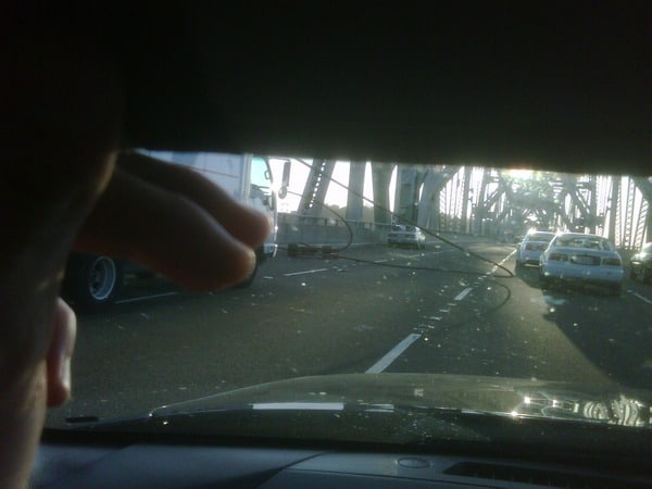 Check out this dramatic photo posted to Twitter today by a very anxious and concerned bridge crosser. That is a cable and steel fragments, fallen from a cantilever section of the famous Bay Bridge which links San Francisco to Oakland; the bridge that commuters universally loathe.