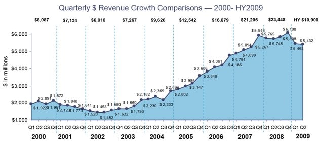 Ad revenue, not surprisingly, is down 5.2% for the first half of 2009 according to a report from PWC and IAB. The big 4 Web companies though also saw revenues decline, so this news is consistent. And given the brutal climate in early 2009, it’s actually not that bad. I have a feeling Q3 numbers and the second half will look a lot better, hopefully just like the San Jose Sharks.