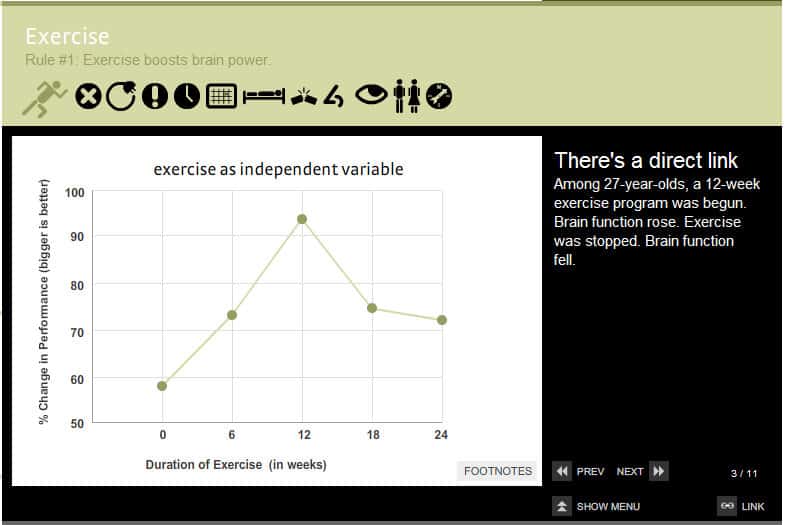 For example, in John Medina’s ‘Brain Rules’, he mentions that exercise can lower our odds of getting Alzheimer’s by more than 60 percent (pg. 16) and a daily exercise routine can significantly boost mental performance.