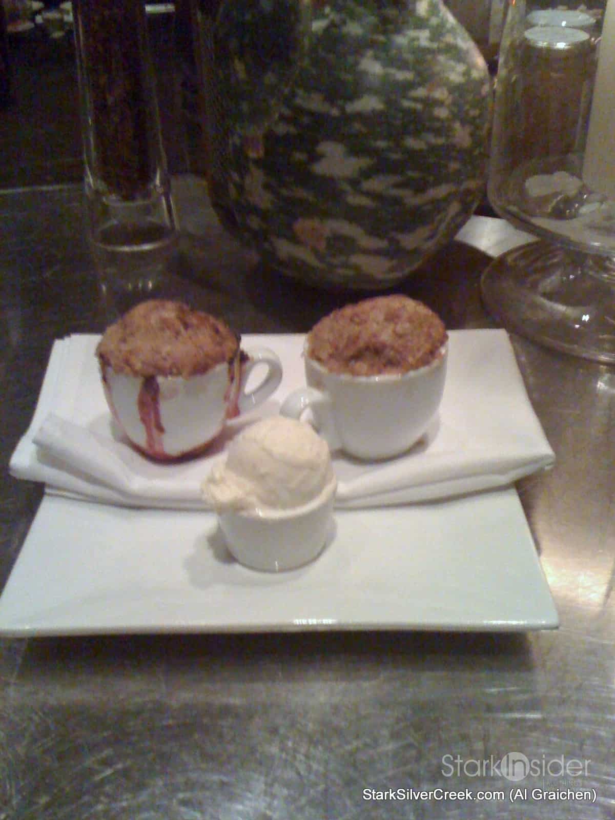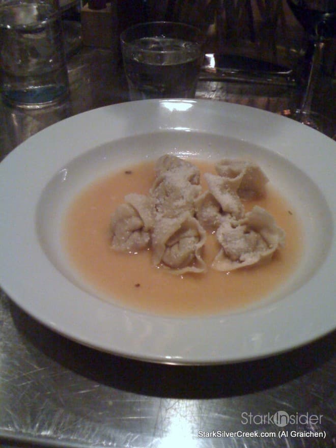 Our entrees were a balsamic hanger steak, pumpkin pie pasta (in spite of the name it was excellent and didn’t resemble a pumpkin pie) and a wild boar tortellini. All were very good and prepared perfectly. For desert we chose berry cobbler which was almost as good as the ones my mother used to make, paired with a Marsala (vigne la miccia) and a Carmenos la Cappuccina.