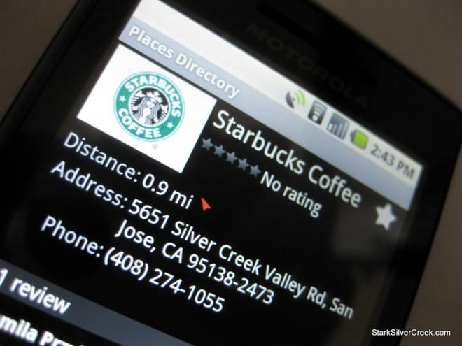 This simple directory uses the GPS to pinpoint your location. You can then search for nearby places using categorized lists. For example, hit Coffee, then the closest Peet’s Coffee and up pops directions. You can use Google Maps or even the awesome Navigation feature to get there. Basic information is included such as address, phone number. There are reviews too. But by comparison, Yelp has far more in that regard, although I could not find a Yelp app on the Market.
