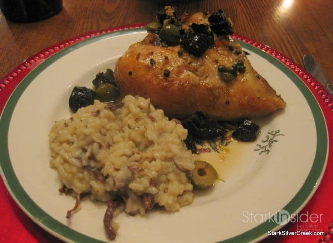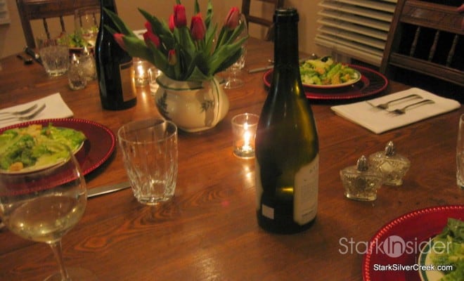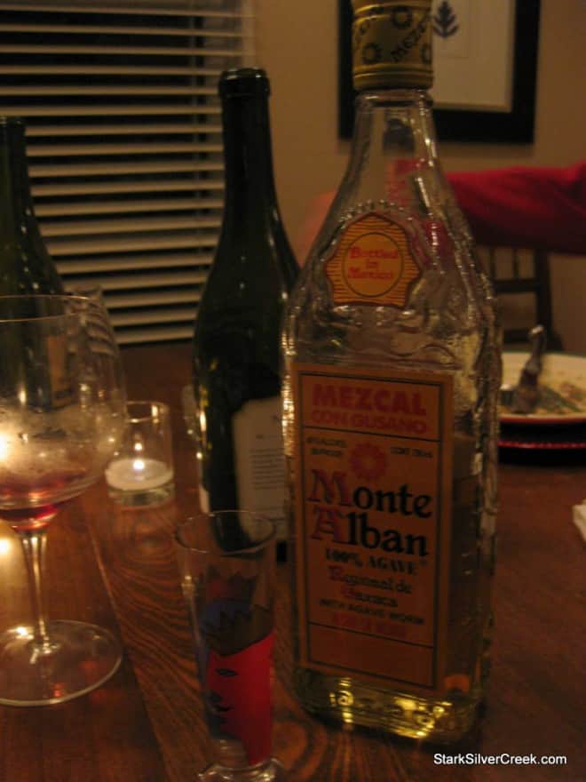 Dinner started off with a Caesar salad, followed on by chicken adorned with a sweet tangy sauce that included prunes and paired with a risotto. Amidst the wine, some mezcal (Wikipedia: “…a distilled alcoholic beverage made from the maguey or agave plant that is native to Mexico.”) was served along with a story about one certain individual who ingested the worm that is at the bottom of a bottle of mezcal.