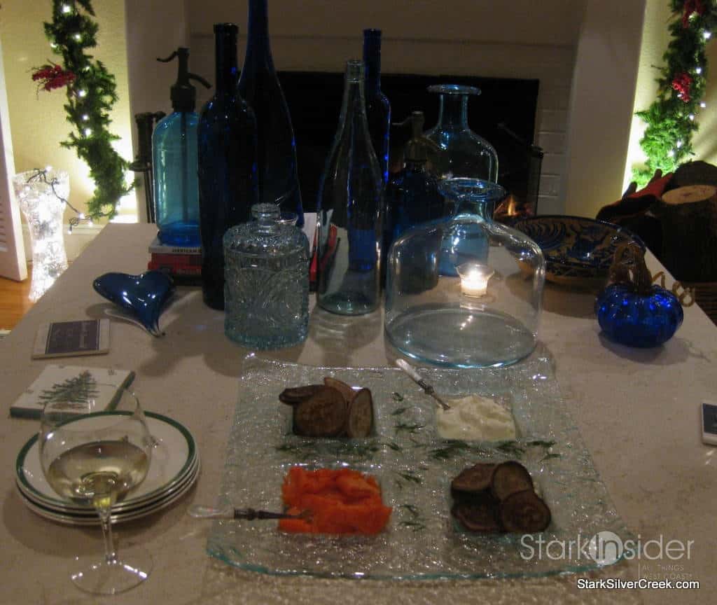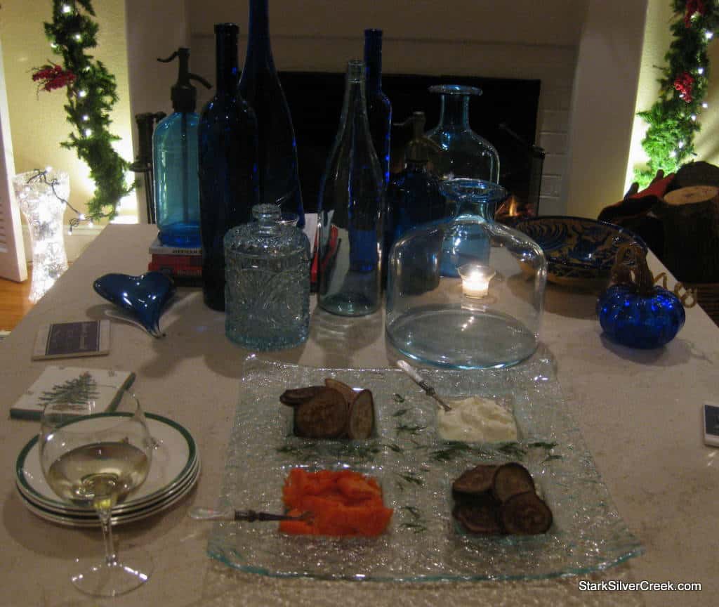A couple of weeks ago, Clint and I finally met up with Pat and Baja Barry at their home for an evening of some more holiday eating and drinking. I love the way Pat and Baja Barry have their home decorated…especially these blue glass bottles and jars that adorn their living room which opens up to a skylight above.