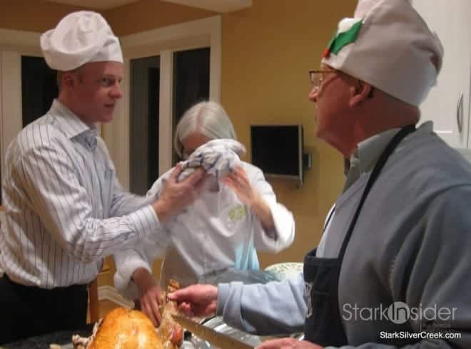 Our 18 pound turkey came out of the oven roasted perfectly golden brown. It was then Clint’s job to haul it from the roasting pan onto a carving plate. He dressed for the occasion in his Mrs. Doubtfire apron ensemble.