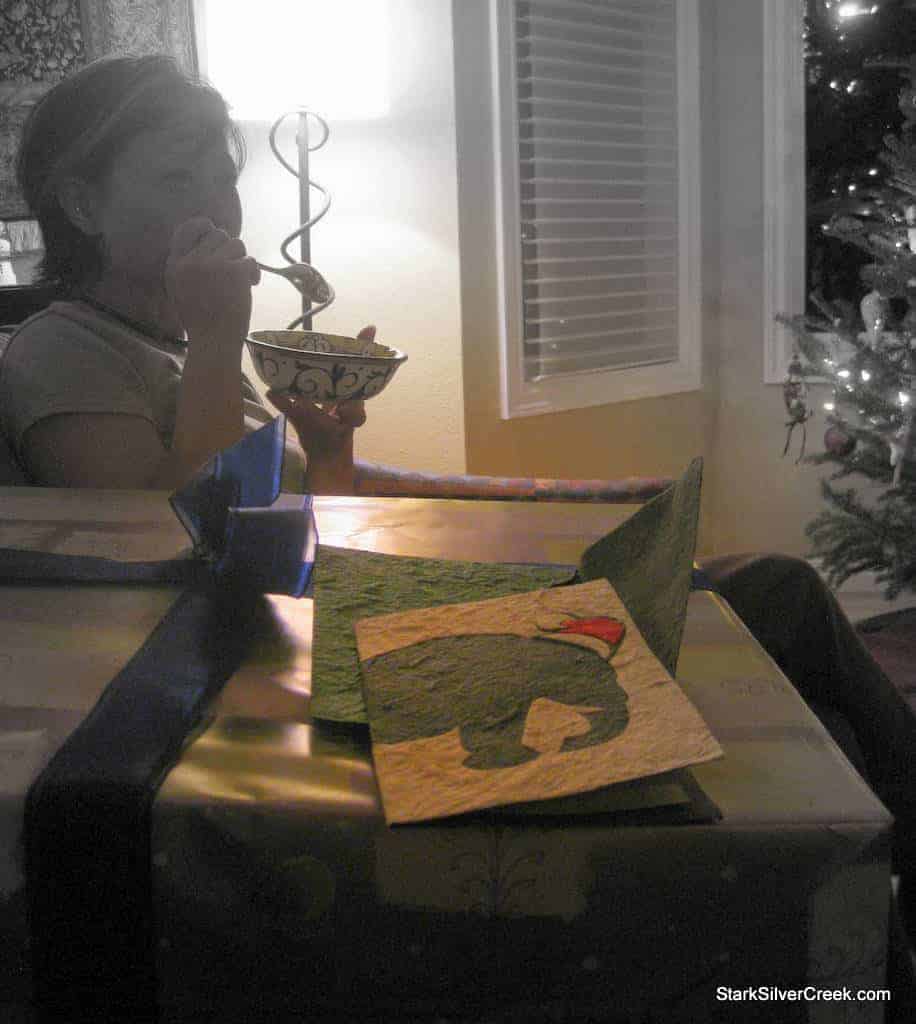 However, I was in disbelief when she told me it was made from elephant poop. Frankly, for a couple of minutes I thought she was pull my leg…or more appropriately…my trunk. Of course with both an Apple iPhone and a Moto Droid in the room, it didn’t take long before Carl and Clint both googled the phrase, “The Great Elephant Poo Poo Paper” to confirm that elephant poop, besides fertilizing the ground can make some pretty cool Christmas cards.