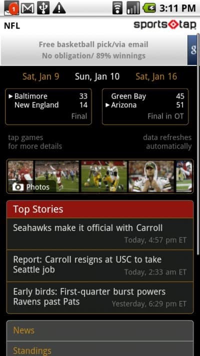 With the NFL playoffs in full swing you’ll want to keep up on the latest news, scores and updates on the road. So we’re looking at one of the best mobile sports apps around; available for both iPhone and Android, it’s called SportsTap. For sports fans, it has just about everything you’d want in the palm of your hand, including all 4 major professional sports leagues: NFL, MLB, NBA and the NHL. Plus it has coverage of NCAA, Auto, Futbol, Golf, Tennis. In addition you can keep tabs on all your local teams by clicking the convenient LocalTap button.