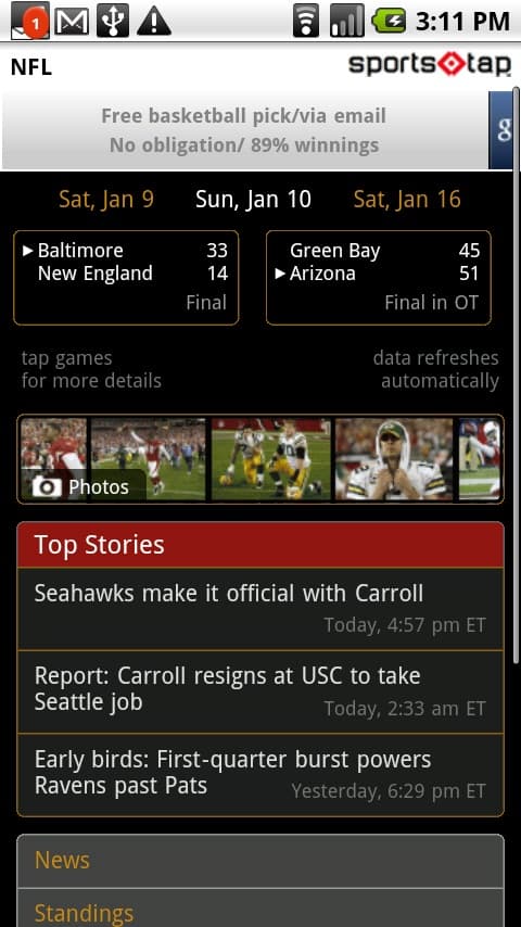 After clicking on a sports category, you’re presented with a summary page. On it you can see the day’s schedule, plus some photos, top stories and links to standings, transactions, and stats.