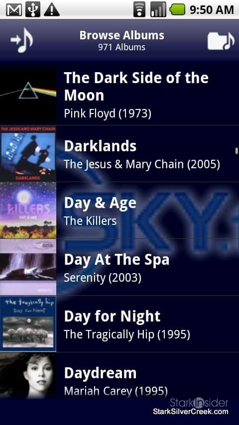 Now, I can control the entire system from the palm of my hand using trusty Droid. And the software is extremely well executed, supporting swiping of screens, pop up menus, large format album art (for me, essential). It’s fast, allowing me to scroll through hundreds of artists on the server upstairs with the flick of a finger.