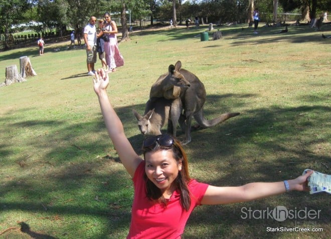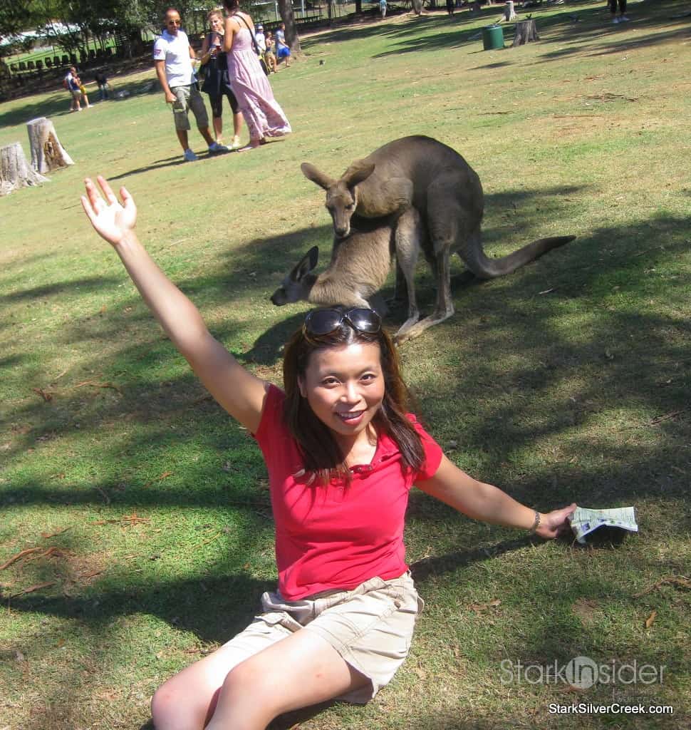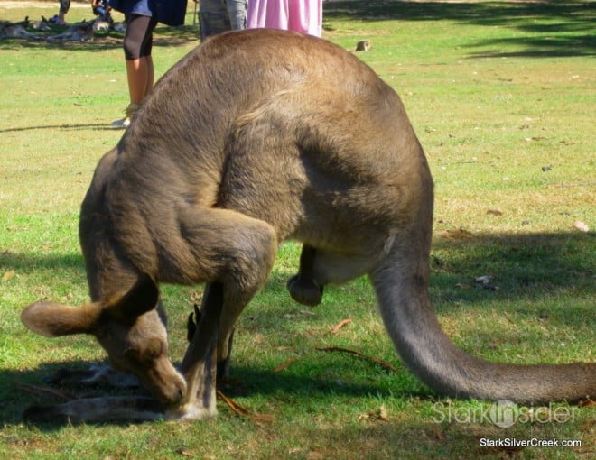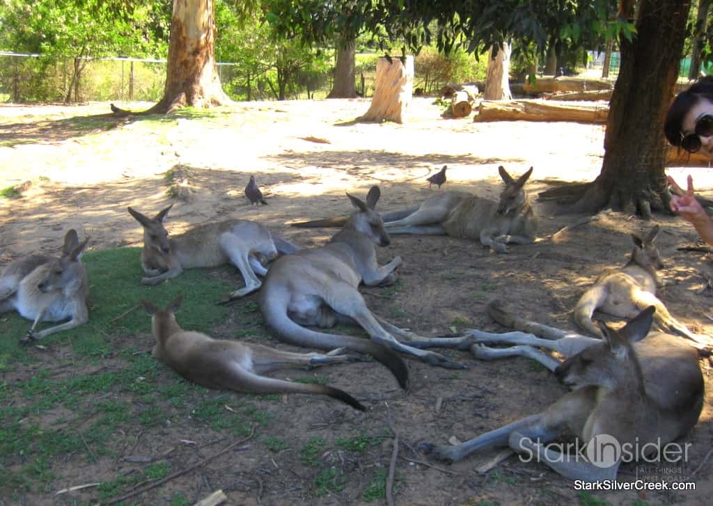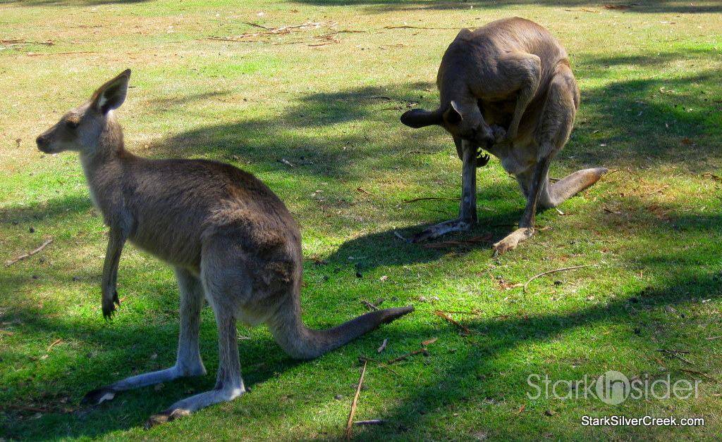 Past the emus were the kangaroos. As I approached two of them, I was not quite sure what they were doing. Then, a group of us realized what they were doing. Some were shocked, others started up their cameras. Can you tell what they are doing?