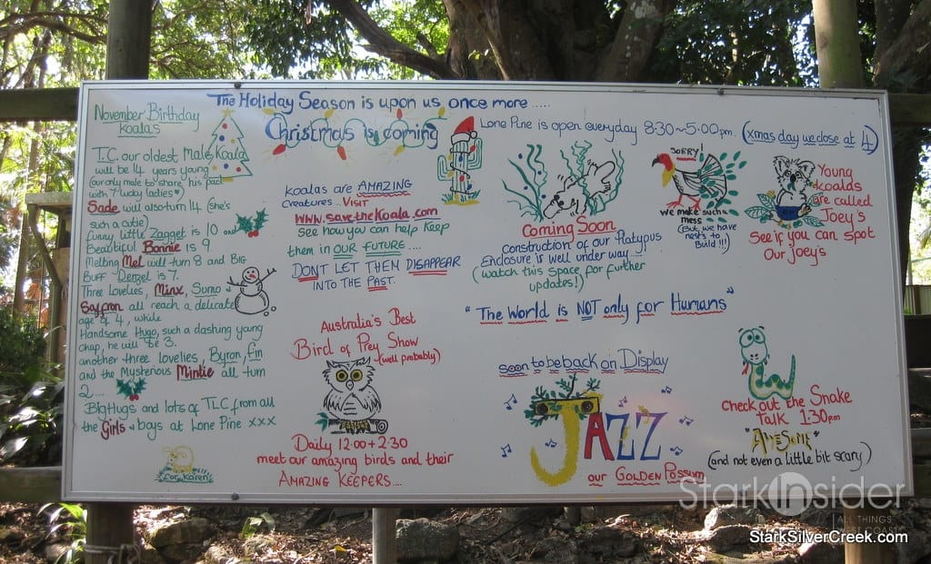 After hearing so much about Koalas, I thought that the only animals I would see on the visit to Lone Pine Koala Sanctuary would be Koalas. Although I saw many of them and even got to hug a koala ($17 AUD), what was surprising was there were plenty of other animals to see as well. If you are at Lone Pine, do get a photo taken with a koala, it is one of the few places in the world where you can still do this. One of the reasons is that a reserve needs to have a lot of koalas since each koala is regulated not to be handled by visitors for more than 30 minutes a day. The fee for the photos help to support the sanctuary.
