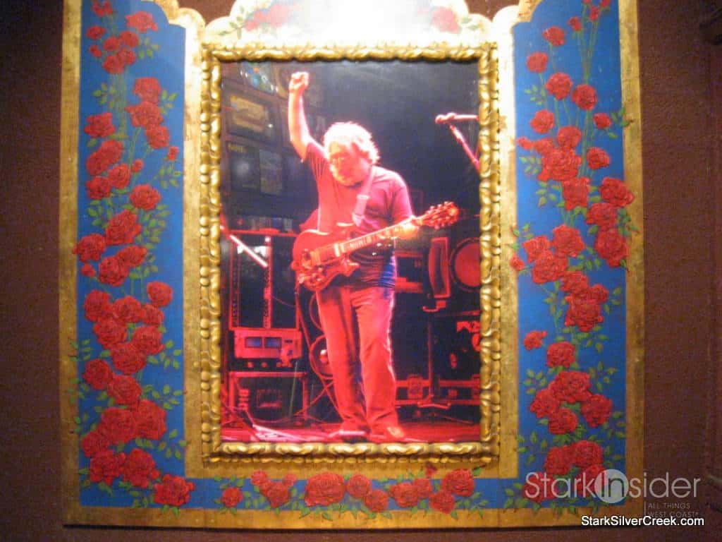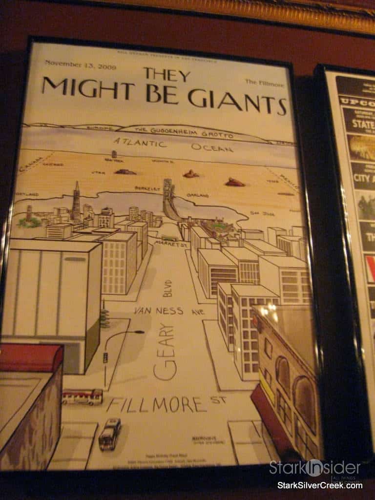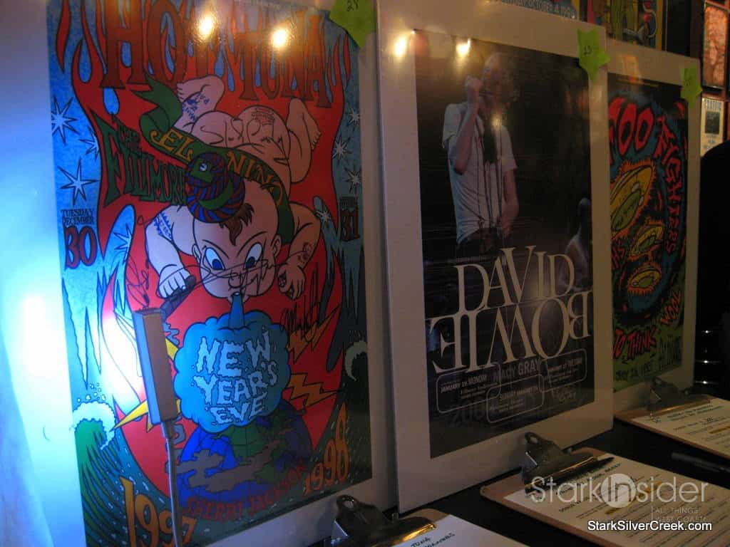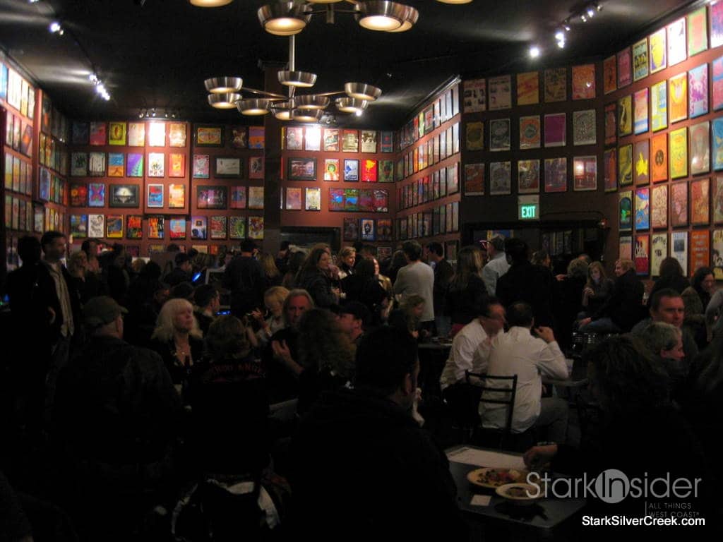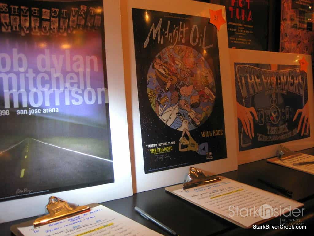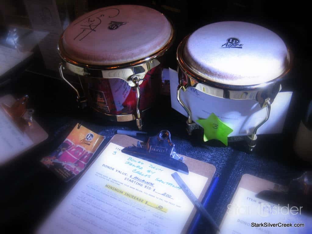 Upstairs, the Bill Graham Memorial Foundation had organized the silent auction. Goodies to bid on ranged from signed posters from performers, many of them concerts that Bill promoted, bottles of wine including some Duckhorn Cabernet, and CD collections. Some unusual items included a customized electric guitar, bongo drums signed by Carlos Santana himself, and VIP events such as a dinner for 10 at a winery or to be part of U2’s inner circle at their next concert. There was even a photograph up for grabs of Bill himself giving the finger.