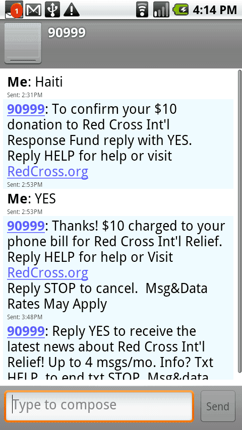 Simply text the message “Haiti” to 9099 and a $10 donation will automatically be made, and charged to your cell phone bill.