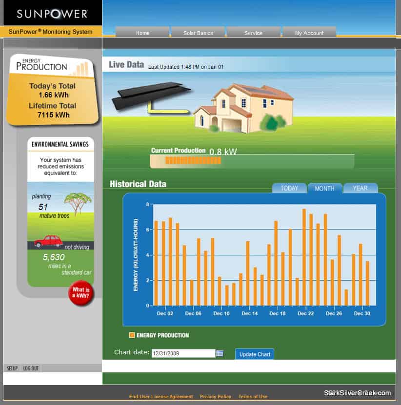 It’s time for the monthly solar update and the end of year round up on our Sunpower solar energy panels. With the shortened daylight hours in the winter and the cloudy days, the solar production, as expected, is about 1/3-1/2 of what it is during the summer months.