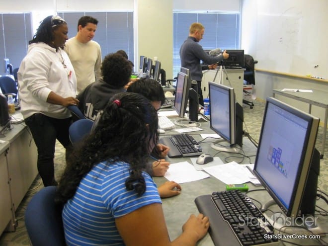 The mood was very different than last week when teams were clustered around brainstorming and selling each other their ideas for various aspects of the film. This week, teams were in quiet focus, putting together aspects of their production. Each team has at least one lead who helps to mentor the participants through this process. There are also several volunteers who have expertise in various aspects of film making coaching and guiding.