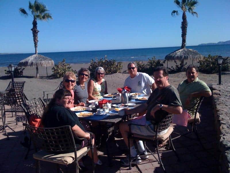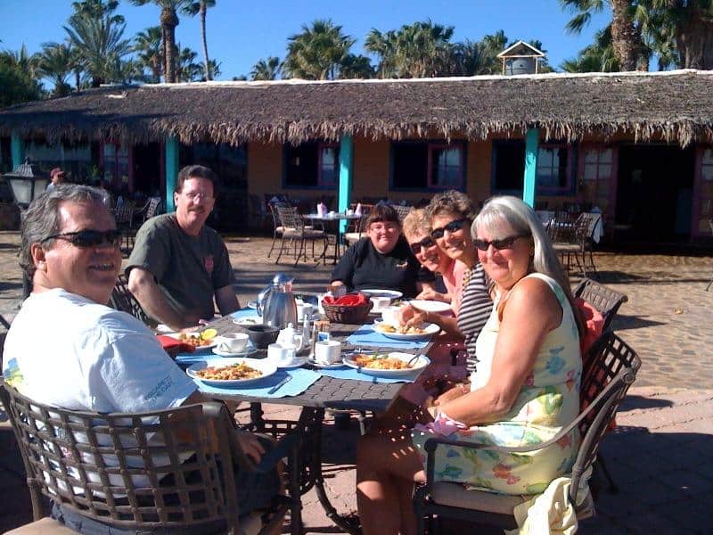 It was a perfect January day for brunch on the beach and a fun place to get together with friends and hang out in the sun. At first we had much to much attention paid to us by some bees….this did dissipate after a while. I have found that in the States, it is difficult to find good food and a beautiful view in the same restaurant. But in Loreto, I’m already a fan of Picazon and Del Borracho. And of course the Clam Shack has a huge following. I have heard mixed reviews for the food at The Oasis Hotel…but great reviews for breakfast. So off we all went one morning. We were pleased to find a well cared for patio area. We sat in the sun because it was warm but not too hot. I ordered my favorite huevos rancheros. And I was really pleased with my food. The cheese was an unusually bright orange color but the meal was good and it was so enjoyable to sit and watch the water and feel the sun on my face. We had a great time. And as always, the company of good friends made for a very special time.