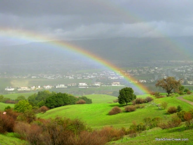 Rainbow spotting on a day of scattered showers in the SF Bay Area BY Loni Stark 02.06.2010 Modified date: 02.06.2010 Rainbow appeared after a few minutes of intense rain. Rainbow appeared after a few minutes of intense rain. Just caught this photo of the rainbow that appeared in the preserve behind our home in San Jose. Pretty incredible.