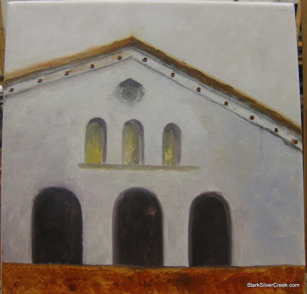 After sketching out the Lucie Stern Theatre building on canvas last week, I embarked on my first pass across the canvas with my oil paints.