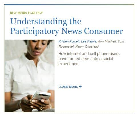 It states, “33% of cell phone owners now access news on their cell phones. 28% of Internet users have customized their home page to include news from sources and on topics that particularly interest them. 37% of Internet users have contributed to the creation of news, commented about it, or disseminated it via postings on social media sites like Facebook or Twitter.”