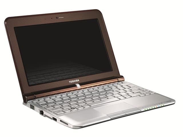 The overall design is solid and aesthetically pleasing. The lid, for example, has a textured design (available in brown, blue, black) with the Toshiba logo centered. Popping it open reveals a spacious keyboard (by netbook standards), a large trackpad, and glossy 10.1″ screen. Oddly the bezel surrounding the screen looks far bigger than it needs to be, although I suspect this is to allow for the larger keyboard area.