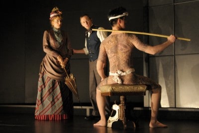A simple set, a seemingly provincial woman. However, as one slips out of dress and into kimono, human desires are uncovered, tattoos intertwine and true identities revealed. Just as we start to question the accuracy of our perceptions of people and situations, Iizuka starts to waver our trust in even basic fundamentals such as what is captured through the lens of our eye or that of a camera.