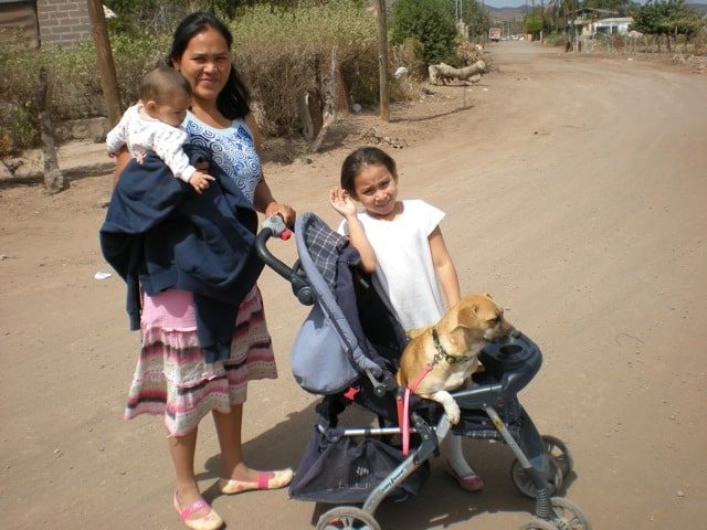 As the day progressed, the line of dogs, and one cat, waiting for surgery grew. Sometimes the place felt more like a MASH unit, with dogs coming into our “recovery area” almost faster then we could handle. Several local families came to choose puppies. The first family actually chose the mother of an adorable puppy. The mother was still very young herself. They named her Toby and wheeled her home in a baby stroller. (see the photo above)