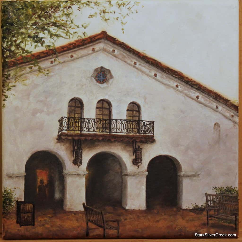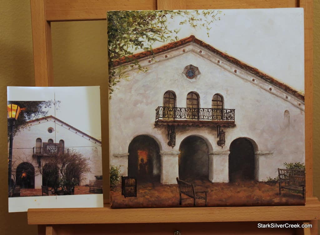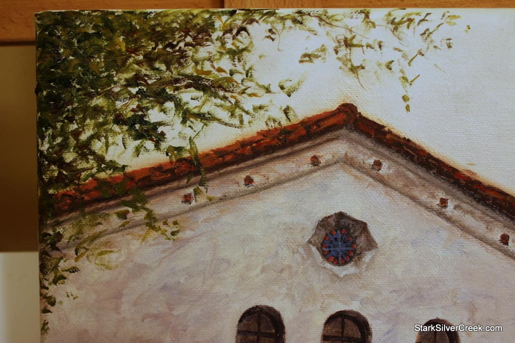 I am a little nervous about the next step in this painting where I will add additional trees and bushes in front of the Lucie Stern Theatre. I want to get this right as I really don’t want to have to paint the Lucie Stern building over again.