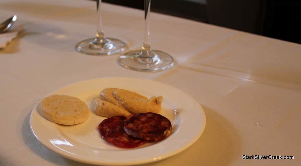 I am instructed to sip from one of the two wine glass, which are now filled with clear liquids and then taste one of the items on the plate. I did note a difference. The soft velvety influence of one water compared to the sharp, cleasing nature of the other. What I couldn’t figure out though was if it was the terroir, or the mere fact that one was flat and the other a sparkling water.