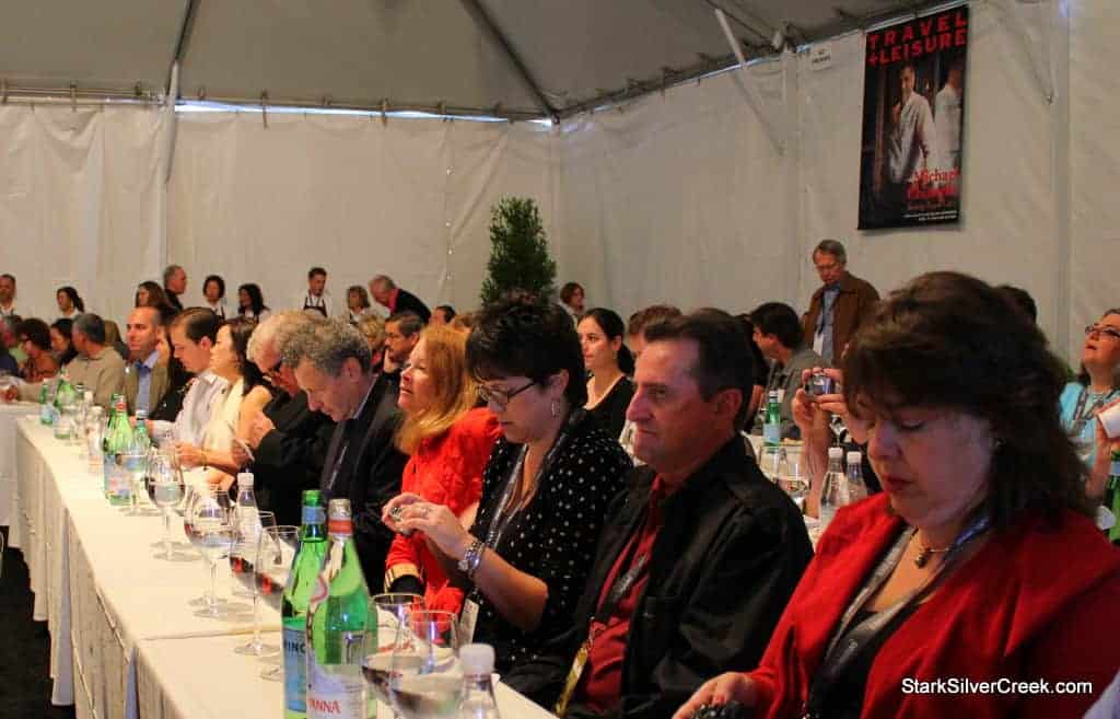 Outside the winds are scraping along the Pacific Ocean and beating against thick white fabric held taunt against the frame of the large tent here at the Pebble Beach Food & Wine event. Inside a crowd forms and starts to wind its way into seats cozied up next to crisp white tablecloths. Each long row of tables is peppered with little plates of sausage, pita and humus. Empty wine glasses stood tall in anticipation of their thirst being quenched.