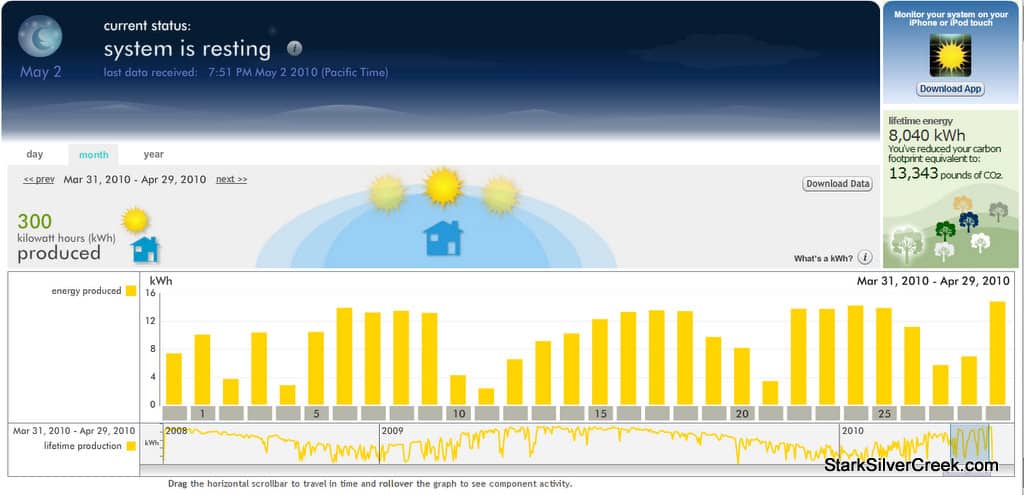 The graph for the energy production of our SunPower solar panels tells the story of April. April showers bring May flowers. The various dips in production curve signals days in which it was cloudy and rainy in April.
