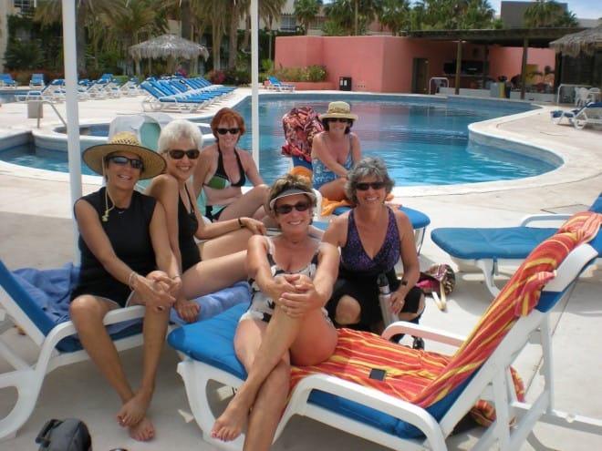 In the afternoon, we went down to the beach and ended up at the pool hanging out with Ariel, Eve and our friend Linda and her sister, Erin. It is unusual, as adults, to have so much unpressured time for conversation, deep and silly. It’s one of our favorite parts of our lifestyle here. We also got to cheer Denny, Brian, Mike and Chris on as they headed off to kayak and fish. They came back later saying something about that huge one that got away.