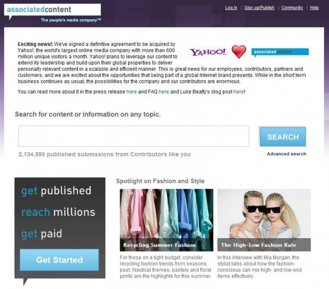 From an FAQ about the deal, “By adding Associated Content to its network of properties, Yahoo! can boast the web’s most sophisticated crowd-sourced content platform, over 2 million articles and videos and, most importantly, you – the web’s largest, most prolific and talented community of content creators.”