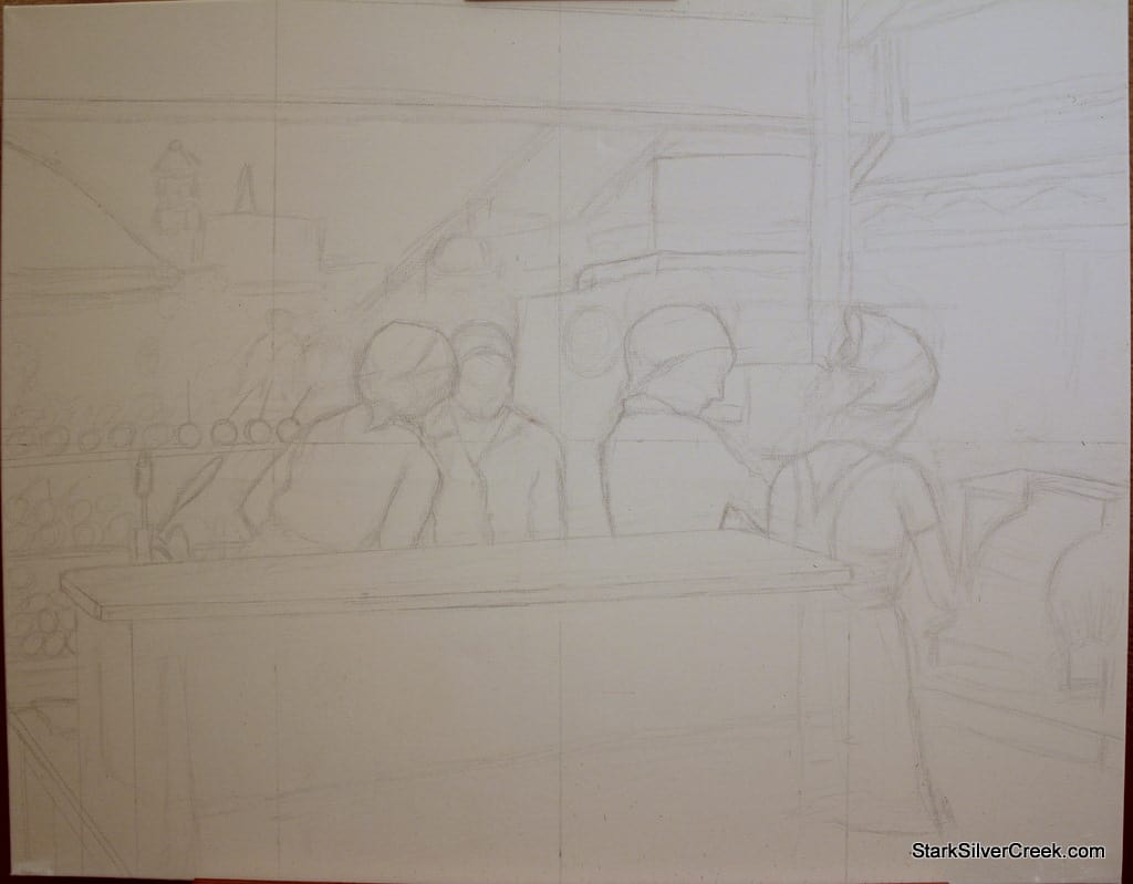 This week, I continued to block off my latest painting. It is an ambitious endeavor given my limited experience in the area of oil painting. I chose it because of the bright colors and the people in the foreground. And it is these people that are troubling me. My initial sketch of the four girls working the candy apple and lemonade stand was just too tall. I didn’t realize this until after I had them all sketched in and a couple of days went by.