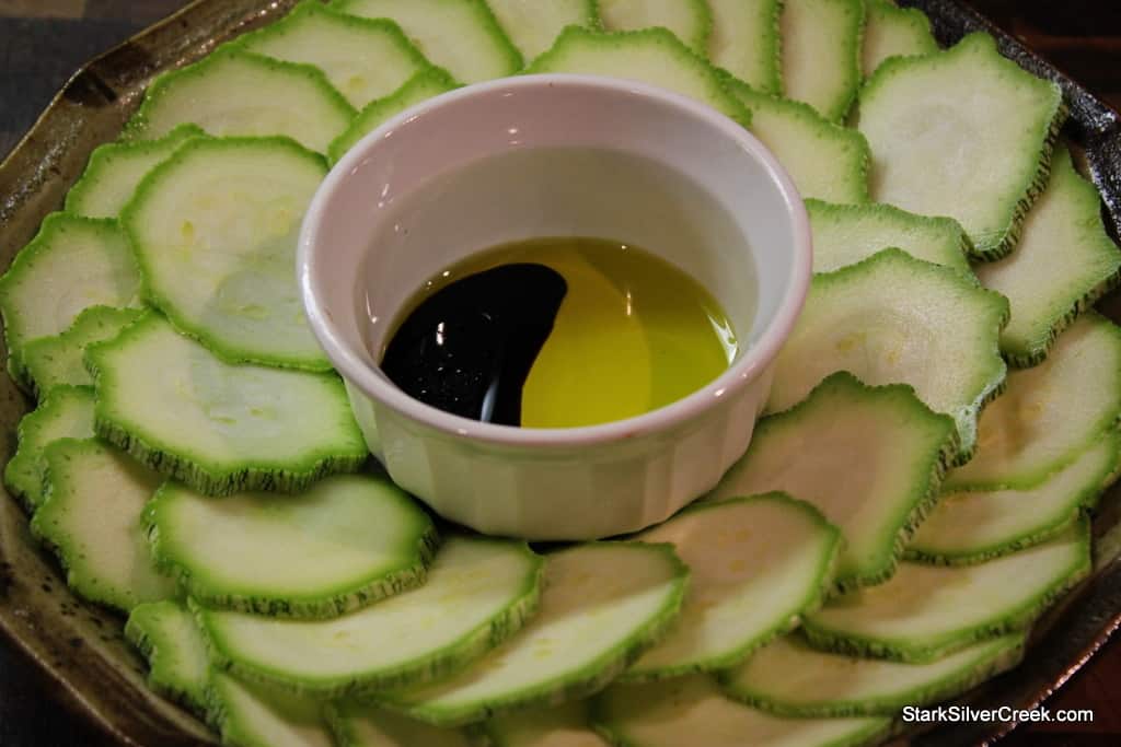 In a small bowl, add 3 tablespoons of extra virgin olive oil and 3 tablespoons of aged Balsamic Vinegar of Modena. If you have an olive oil and balsamic vinegar collection, this is the perfect time to test out some of the different flavors. You could even arrange several small bowls and have a olive oil and balsamic tasting area. I digress. My point is you can dress up or dress down this recipe. Add a dash of freshly ground pepper and sea salt.