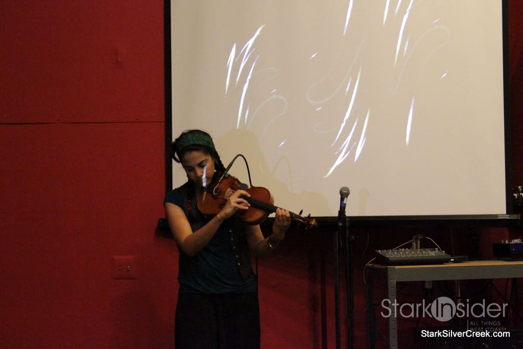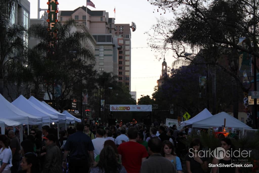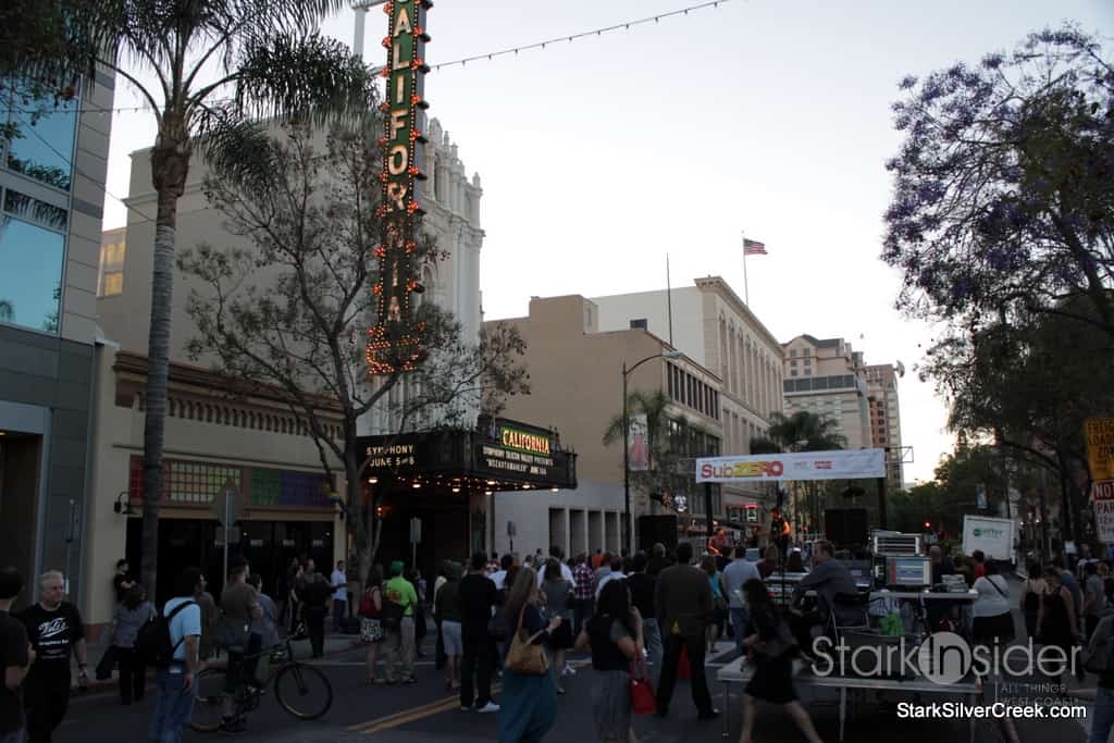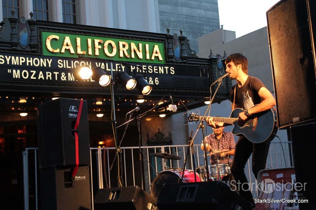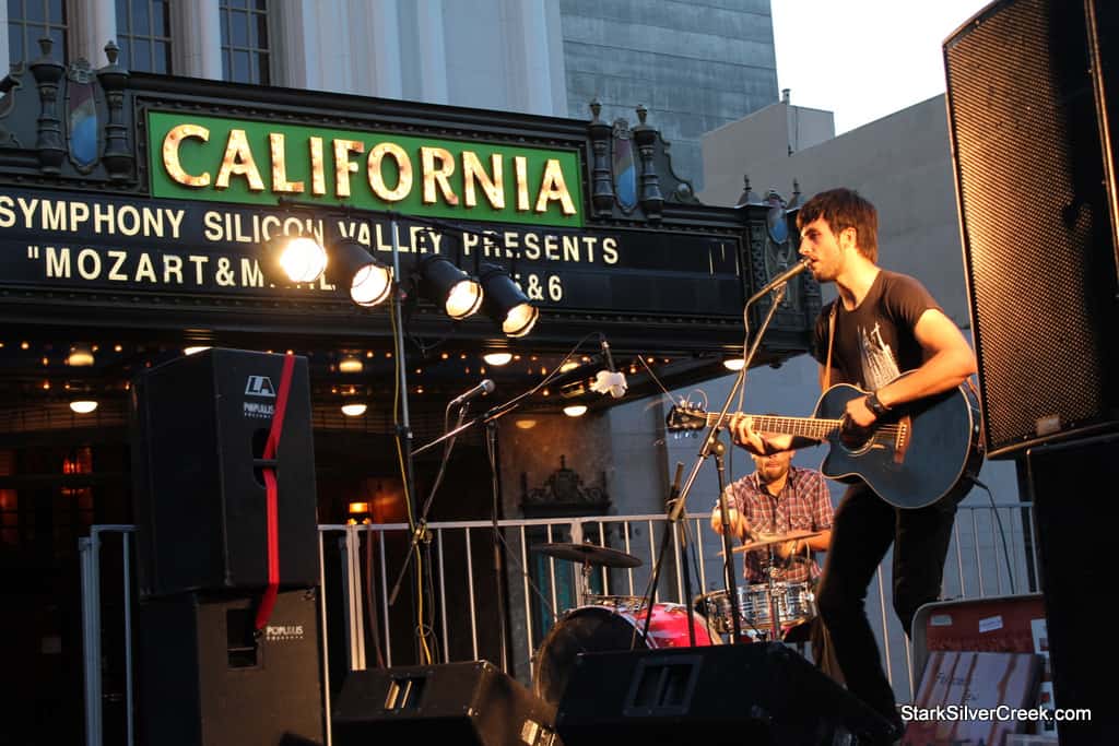 I was impressed with the two-man band, The Ferocious Few; their raw energy had the place rocking earlier in the evening. Who knew that just two hyper-energetic guys could generate so much wild sound? I don’t think I understood a single word, or lyric. And it was great, especially with the majestic California Theatre’s marquee towering next to the stage.