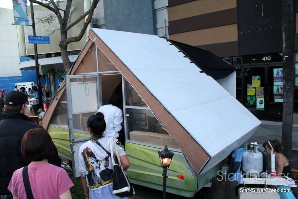 Are We There Yet? The Wondrous Traveling Trailer by Genevieve Hastings was an oddity that amused with waves of people clamoring to check out the interior of the “moving piece of art.” It houses an interactive postcard station, several audio seats, suitcase sculptures with videos inside. Its purpose? Who knows, but people liked what they saw. Genevieve spent some time with Loni in the ultimate-cramped-SSC-on-location-video segment. More on that soon.