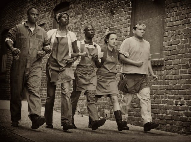 The plot of Possibilidad involves two struggles – one in the U.S. and the other in Venezuela for worker-owned collectives. However, the heart of this is in the characters – and there were no weak links in this cast. Ernesto Jenkins (Rotimi Abbabiaka) as the self-absorbed new-agey factory boss of the Peaceweaver hemp ware was incredibly funny – but performances by the rest of the cast were equally strong. The range of Brian M. Rivera and Velina Brown were particularly impressive. I confess, the cast had me with the opening tango number. It takes an intensely talented cast to keep an audience attention in an open air venue – and the SF Mime Troupe more than adequately delivered.