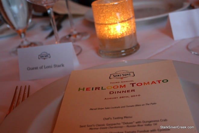 When vine-ripened and picked at its peak, heirloom tomatoes are simply the perfect muse for a summertime feast. Especially one conceived by chef and proprietor Josiah Slone of Sent Sovi Restaurant, tucked neatly in quaint downtown Saratoga. I had the pleasure of attending the Third Annual Heirloom Tomato Dinner, a five course exploration into the many ways one can prepare and pair this savory, edible fruit. A peculiar point to note here is that even though botanically the tomato is considered a fruit, for culinary purposes it is classified as a vegetable.