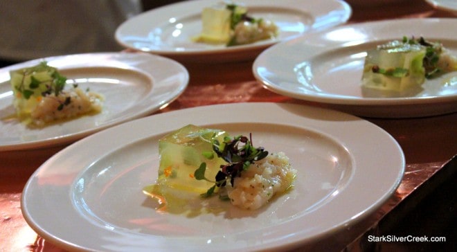 The third course was the most unusual of the evening: Green Grape Terrine with Scallop Tartare and Tomato Water Ice. It was beautifully plated and a curiosity to eat. Whereas the previous dishes had familiar comforting flavors, this dish served to amuse my taste buds. Chef Josiah noted he was playing with the buttery and Umami flavors in this dish. Of all the wines of the evening, Josiah spoke most passionately about the Pinot Noir served with this course. He considers 2008 one of the best vintages of this wine and what makes it even more precious is that the “Palazzio” has since been discontinued.